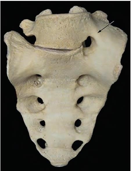 Крестец является связующим звеном в тазовом кольце. В связи с воздействием на него сил давления, обусловленных вертикальным положением тела человека, нередко возникают патологические изменения и деформации. Поскольку через отверстия крестца проходят крупные нервы (отверстия для них хорошо видны на рис. 8), при деформации отмечаются сильные боли. Нередко под воздействием чрезмерных нагрузок происходит изменение межпозвоночного диска и срастание пятого поясничного и первого крестцового позвонков. Данные изменения называют сакрализацией (см. рис. 8).
