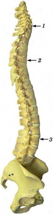 1 – шейный лордоз (изгиб кпереди); 2 – грудной кифоз (изгиб кзади); 3 – поясничный лордоз