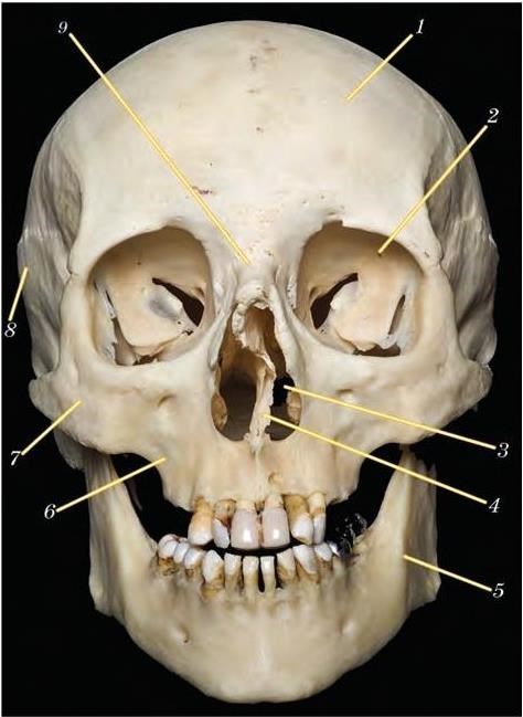 1 – лобная кость; 2 – глазница; 3 – грушевидное отверстие (полость носа); 4 – сошник; 5 – нижняя челюсть; 6 – верхняя челюсть; 7 – скуловая кость; 8 – височная кость; 9 – носовая кость