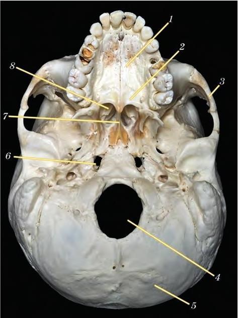 1 – костное нёбо; 2 – нёбная кость; 3 – скуловая дуга; 4 – большое отверстие; 5 – затылочная кость; 6 – рваное отверстие; 7 – сошник; 8 – хоана (полость носа)