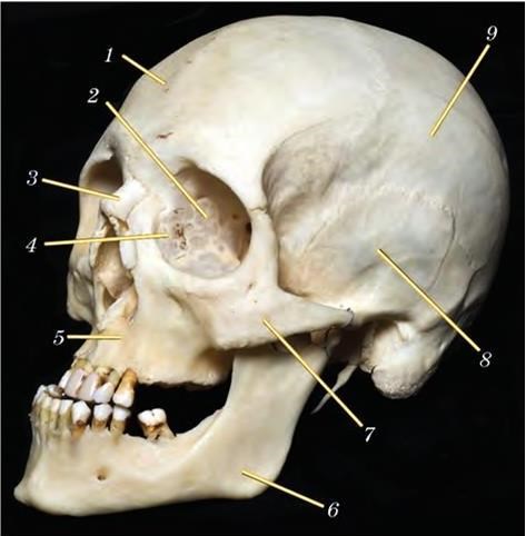 1— лобная кость; 2 – глазничная пластинка решетчатой кости; 3 – носовая кость; 4 – слезная кость; 5 – верхняя челюсть; 6 – нижняя челюсть; 7 – скуловая кость; 8 – височная кость; 9 – теменная кость
