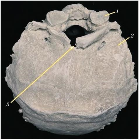 1 – атлант (I шейный позвонок); 2 – затылочная кость; 3 – расщепление задней дуги атланта