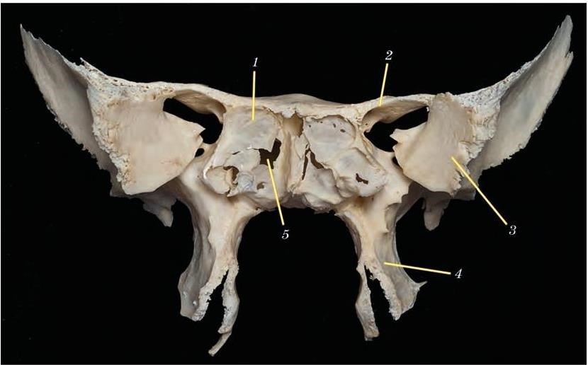 1 – тело; 2 – малое крыло; 3 – большое крыло; 4 – крыловидный отросток; 5 – клиновидная пазуха