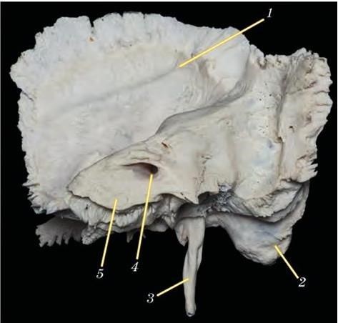 1 – чешуя; 2 – сосцевидный отросток; 3 – шиловидный отросток; 4 – внутренний слуховой проход; 5 – каменистая часть