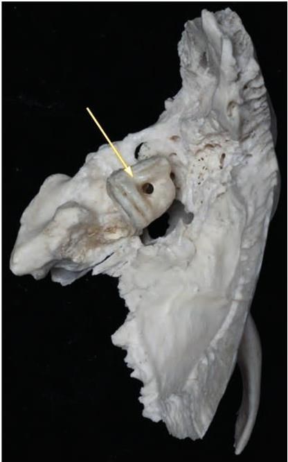 Рис. 17. Височная кость с выгравированным лабиринтом (указан стрелкой). Вид сверху. Натуральный анатомический препарат