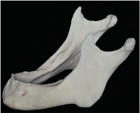 Самой массивной из костей лицевого черепа является нижняя челюсть. У нее имеется две ветви и тело. На каждой ветви находятся два отростка: мыщелковый и венечный (рис. 19). Мыщелковый отросток заканчивается головкой, которая участвует в образовании височнонижнечелюстного сустава. К венечному отростку прикрепляется височная и крыловидная (жевательные) мышцы. На теле нижней челюсти в ячейках альвеолярной дуги расположены корни зубов. При выпадении зубов (чаще всего причиной является пародонтоз) происходит постепенная атрофия альвеолярной дуги: уменьшается ее высота, и костная ткань тела челюсти атрофируется. Полное отсутствие зубов на челюсти носит название адентия. Такая челюсть представлена на рис. 20.