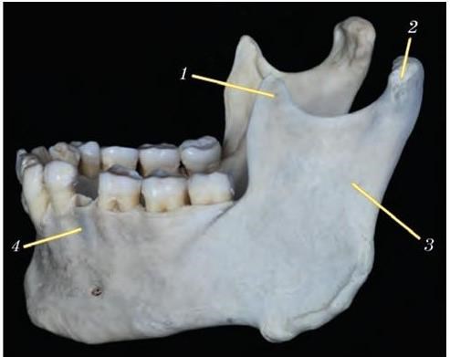 1 – венечный отросток; 2 – головка нижней челюсти; 3 – ветвь нижней челюсти; 4 – тело нижней челюсти