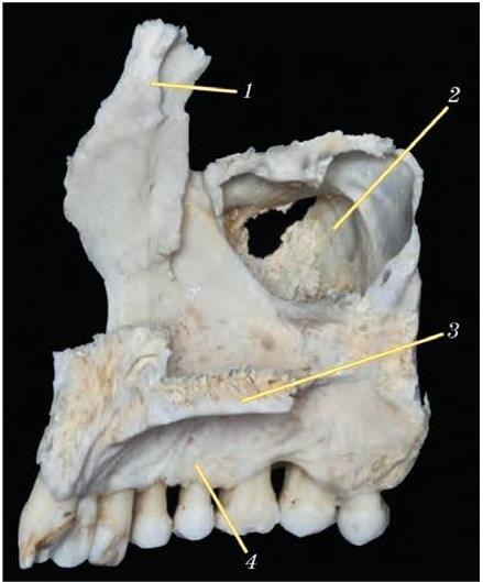 1— лобный отросток; 2 – верхнечелюстная (гайморова) пазуха; 3 – нёбный отросток; 4 – альвеолярный отросток