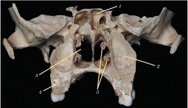 1 – клиновидная пазуха; 2 – верхнечелюстная пазуха; 3 – средняя и нижняя носовые раковины; 4 – верхняя челюсть (альвеолярный отросток); 5 – полость носа