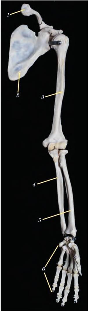 1 – ключица; 2 – лопатка; 3 – плечевая кость; 4 – локтевая кость; 5 – лучевая кость; 6 – кости кисти