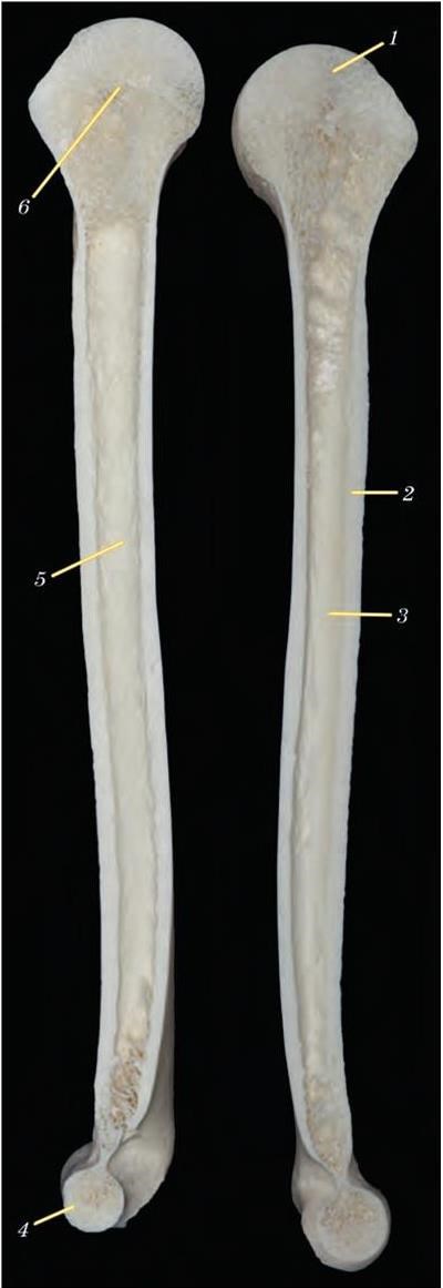 1 – губчатое вещество; 2 – компактное вещество; 3 – костномозговая полость; 4 – дистальный (нижний) эпифиз; 5 – диафиз (тело); 6 – проксимальный (верхний) эпифиз