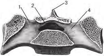 1 – posterior sacral foramen (foramen sacrale posterius); 2 – sacral canal (canalis sacralis); 3 – median sacral crest (crista sacralis mediana); 4 – intervertebral foramen (foramen intervertebrale)