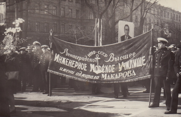Во все великие праздники – 1 мая, 7 ноября – наше училище всегда принимало участие в демонстрациях. Мы не просто ходили строем с флагами, но и изображали разные фигуры. Младшие курсы были задействованы практически все. Начиная с третьего курса наш факультет и факультет судоводителей перешли учиться на Охту, на Заневский проспект, 5, который находится сразу за мостом Александра Невского. Экипаж и учебный корпус были здесь в одном дворе.