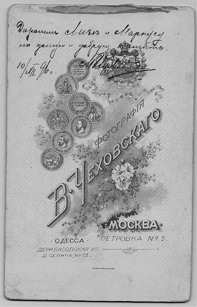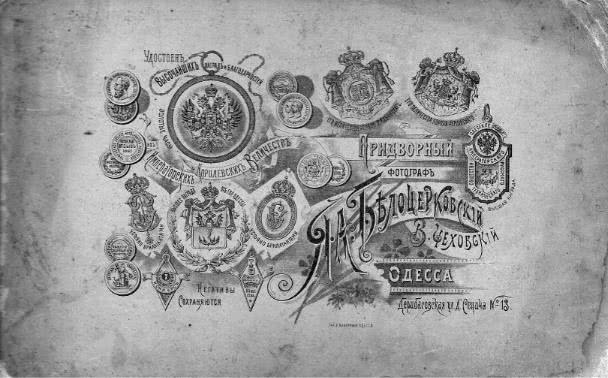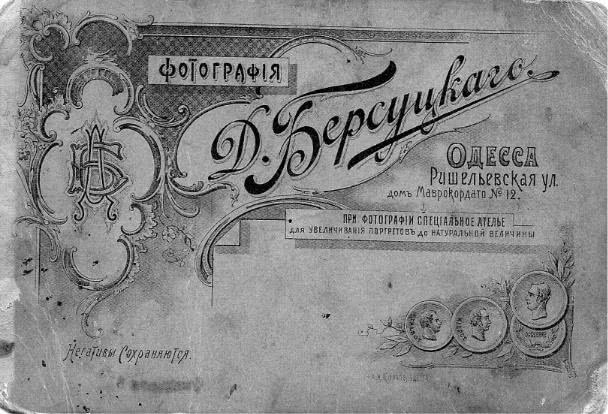 Но, увы, вот и мне, вследствие отсутствия в прошлой моей жизни этого нового магического прибора, поначалу пришлось выращивать генеалогическое дерево на почве разных доморощенных средств. Ими были бабушкино-мамины рассказы, воспоминания родственников, старые пожелтевшие бумаги: письма, записки, дневники, календари. Много сведений дали поблекшие серовато-коричневатые фотоотпечатки, сделанные в начале прошлого века одесской «Фотографией Д.Берсуцкаго» на Ришельевской и «Фотографическим ателье Б.Готлиба» на углу Ланжероновской (рис. 5). Использовал я и такие же труды других своих родственников-современников, старавшихся, вроде меня, протиснуться в узкую щель бесконечного времени.