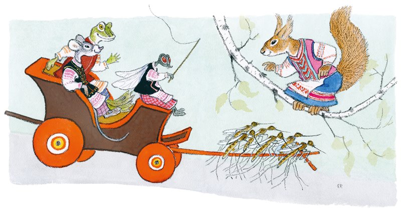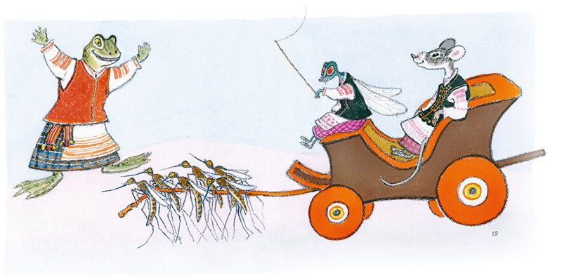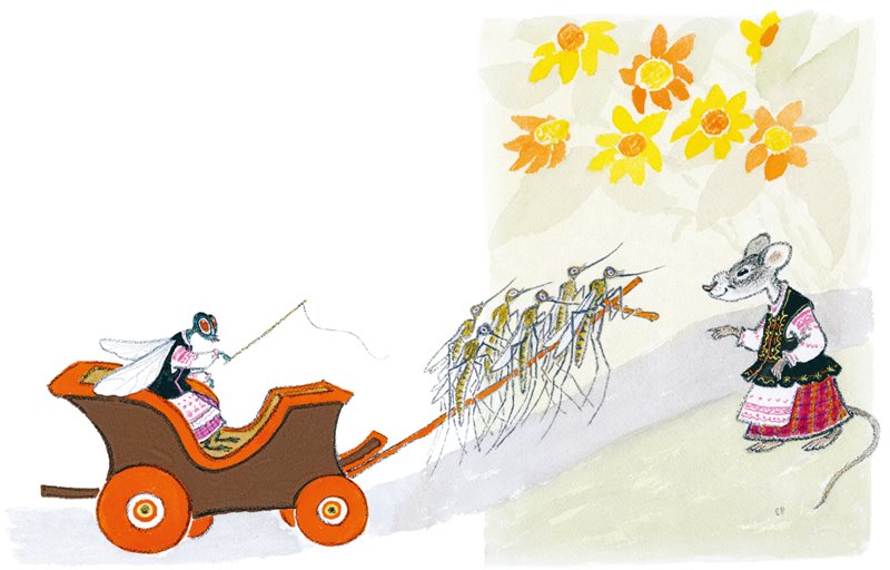 Жила-была муха-певуха. Была у неё коляска да шесть комаров. Запрягла муха-певуха комаров в коляску и поехала на прогулку.