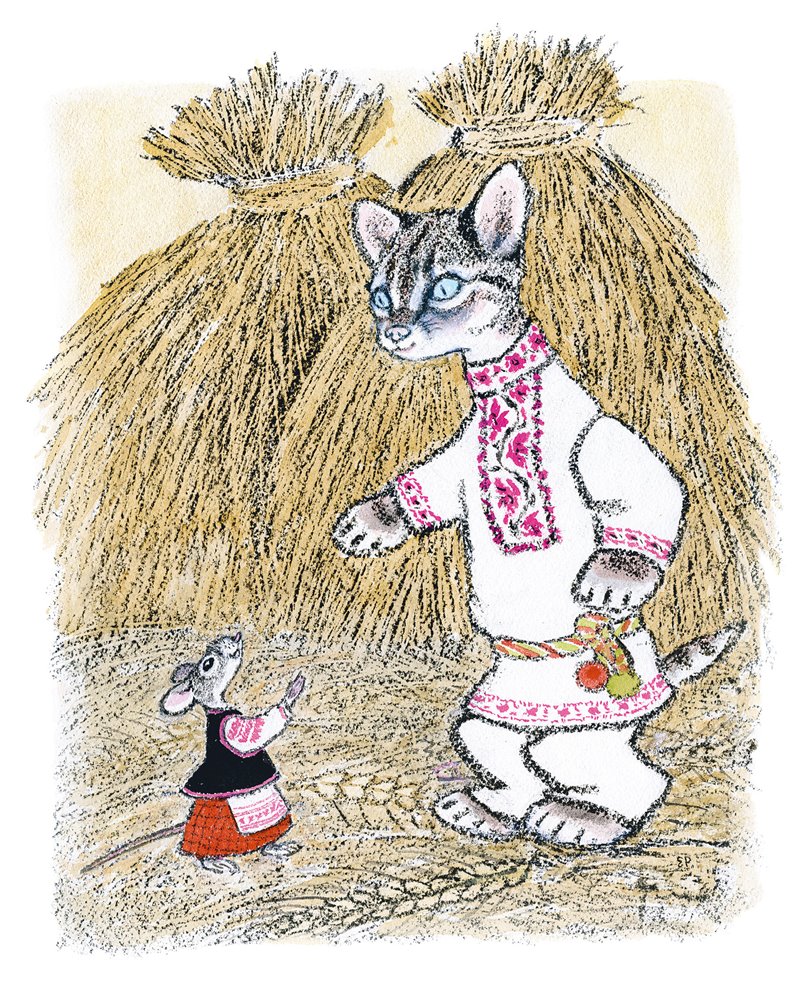 Пошёл Петрик на гумно. Ходил, ходил – никого нет. Вдруг в соломе как зашуршит! Петрик прыгнул и увидел маленького зверька с длинным хвостом.