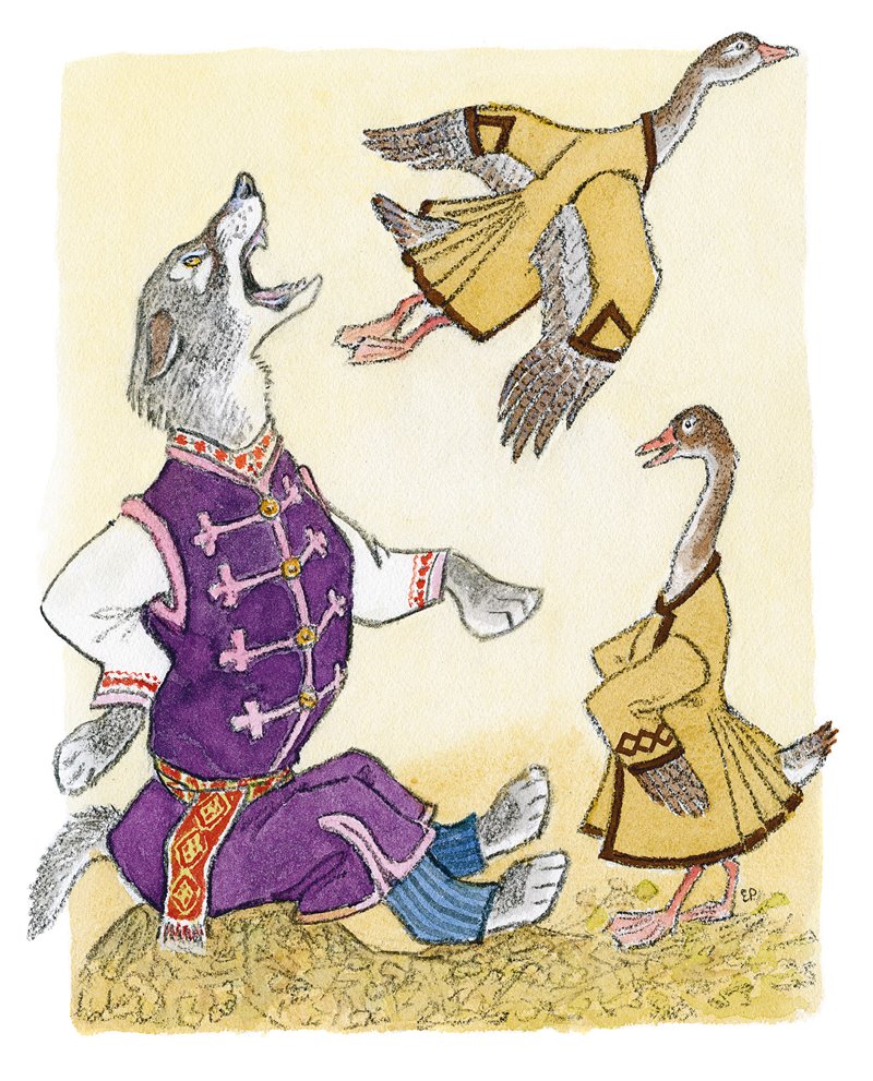 Слез волк с кочки, проводил гусей взглядом и отправился дальше ни с чем. Идёт и ругает себя на чём свет стоит: «Ну не дурень ли? Зачем согласился петь гусям? Ну, теперь кого ни встречу – съем!»