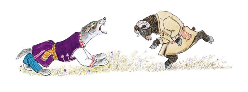 Встал он в ложбинке, разинул пасть и ждёт. А баран взбежал на горку, разогнался и – трах! – рогами волка по голове. Аж искры у волка из глаз посыпались!