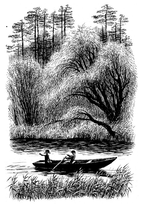 Потом трясогузка улетела и к лодке подошли соседские ребята: Витя и его сестра Таня. Витя осмотрел лодку и стал тащить её к воде. Таня сосала палец и смотрела на Витю. Витя закричал на неё, и они вместе спихнули лодку в воду.