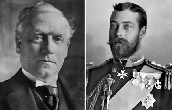 Премьер-министр Великобритании Герберт Асквит (1852–1928) слева и английский король Георг V (1865–1936)