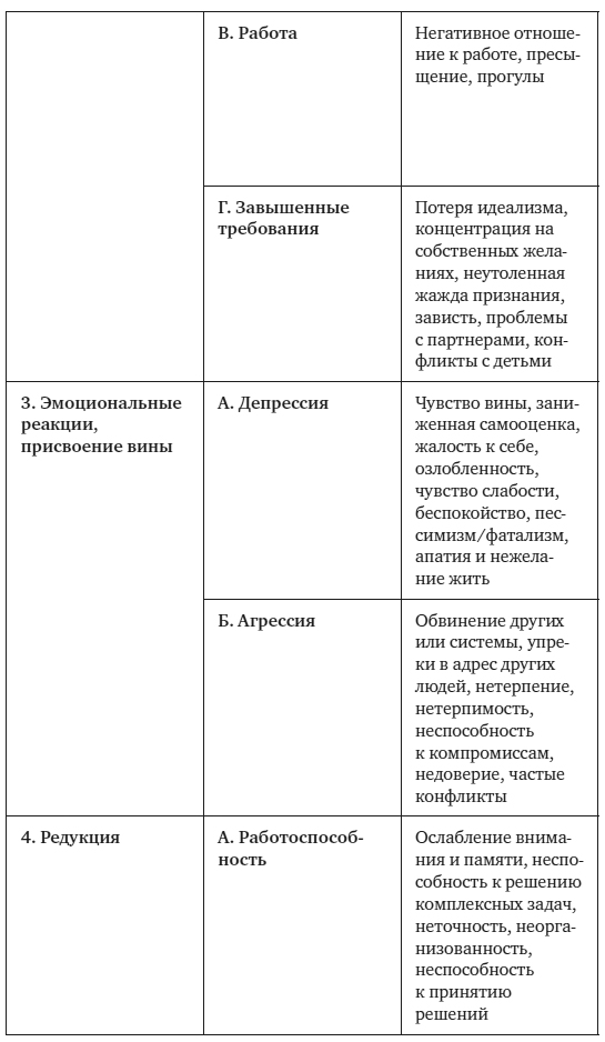 3. Этап фрустрации характеризуется постепенно развивающимся чувством беспомощности в связи с неоправдавшимися идеалистическими ожиданиями первого этапа и неудовлетворенностью личных потребностей второго этапа. Как правило, на данном этапе наблюдаются аффективные, когнитивные и соматические симптомы.
