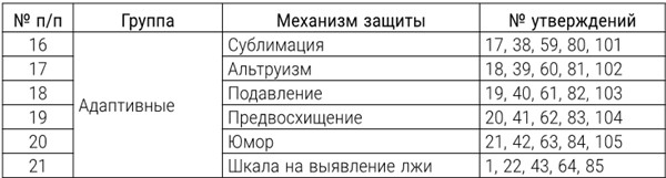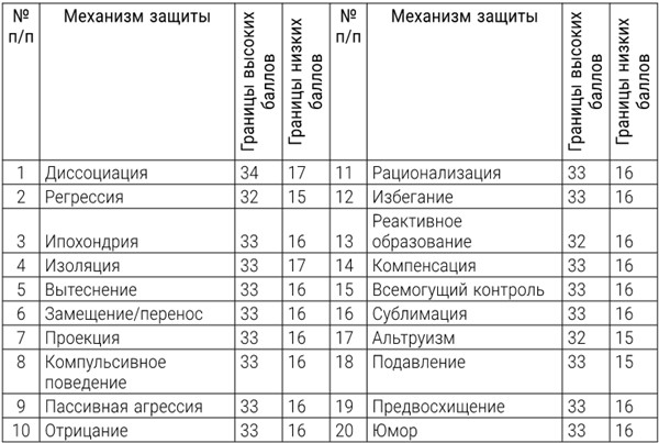 Интерпретация результатов. Показатели испытуемых группы юношеского возраста свидетельствуют о более частой встречаемости «Изоляции» и «Компульсивного поведения»; анализ данных испытуемых группы зрелого возраста свидетельствует о более высоких показателях по шкалам «Сублимация» и «Подавление импульсов»; и наконец, анализ данных испытуемых группы пожилого возраста указывает на высокие показатели по таким шкалам, как «Пассивная агрессия», «Отрицание» и «Ипохондрия».