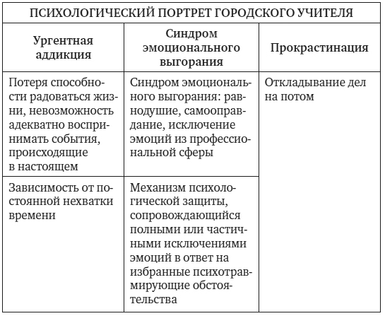 Для ургентных аддиктов характерны повышенная озабоченность внешними оценками, неудовлетворенность собой, эмоциональная отстраненность, угнетенность, чувство опустошенности (Вырвич А. Ч., Андреева И. Н., 2020). Основываясь на результатах проведенного исследования, авторы схематически представляют психологические портреты сельского и городского учителя с ургентной аддикцией и прокрастинацией.