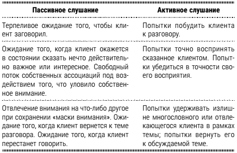 Активное слушание помогает сосредоточить внимание на клиенте, понять его и «разговорить». Оно отличается от пассивного слушания, применяемого в психоанализе, по следующим показателям (Сидоренко, 2008):