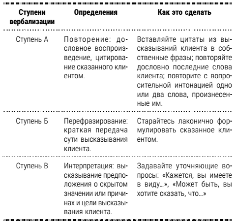 Вербализуя чувства клиента, начинайте со следующих слов: «Возможно, вы чувствуете… Не чувствуете ли вы себя несколько… Мне показалось, что вы… Может, вам… Похоже, вы… Мне кажется, вы… Я почувствовал, что… Интуиция мне подсказывает, что… Я чувствую, что… В ваших словах я ощутил… Если я не ошибаюсь, вы чувствуете…»