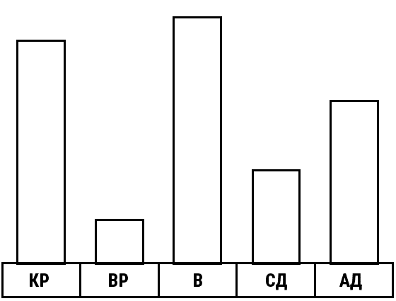 Колонки эгограммы соответствуют пяти основным состояниям «Я»: КР – Критикующий Родитель, ВР – Воспитывающий (Заботящийся) Родитель, В – Взрослый, СД – Свободный Ребенок и АД – Адаптивное Дитя (Приспособленный Ребенок). Высота колонок соответствует представлению о том, какую часть времени вы проводите в каждом состоянии. Сделайте свою эгограмму.