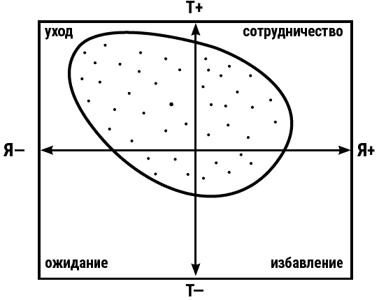 На горизонтальной оси слева обозначена позиция «Я – не о’кей», справа – «Я – о’кей». На вертикальной оси вверху – позиция «Ты – о’кей», внизу – «Ты – не о’кей».