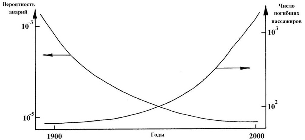 Рис. I. Риск аварий и число погибших пассажиров в ходе развития авиации