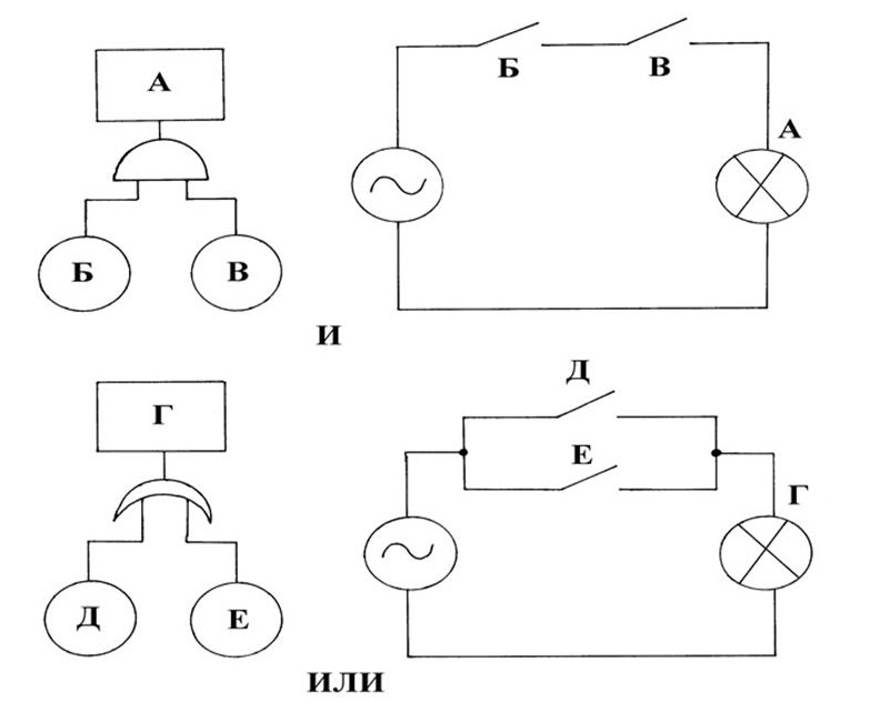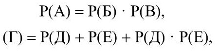 Операция (или вентиль) «И» указывает на то, что, для того чтобы произошло событие А, должны произойти оба события: Б и В. Операция «ИЛИ» указывает, на то, что для того чтобы произошло событие Г, должно произойти одно из событий: Д или Е.