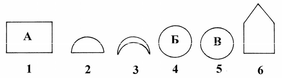 1 – символ какого-либо события; 2 – символ «И»; 3 – символ «ИЛИ»; 4, 5 – символы, обозначающие исходные события, обеспеченные (достаточными) данными; 6 – домик, событие, которое может случиться или не случиться