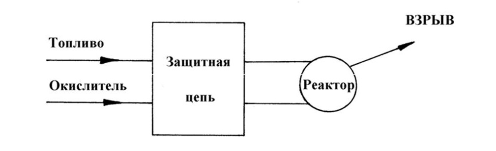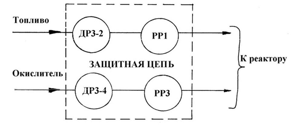 Венчающим событием работы блока питания реактора будет взрыв из-за неправильного соотношения в нём «топливо – окислитель». Для предотвращения реактора от этой опасности используют защитную цепь, в состав которой входят установленные на линиях подачи топлива и окислителя два датчика расхода ДР-2 и ДРЗ-4 и два регистрирующих регулятора расхода РР-1 и РР-3 (рис. 2.5). Венчающее событие – взрыв – происходит, когда во взрывчатой смеси возникает зажигание, а также когда интенсивна подача топлива или слишком низка подача окислителя.
