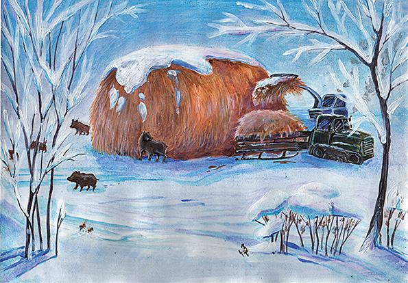 Перед ними раскинулось широкое поле, укрытое белоснежным сверкающим снегом, посреди которого стоял стог соломы. Около стога стояли два трактора с прицепами, на которые грузили солому. Лязг металла напугал животных, прятавшихся в стогу.