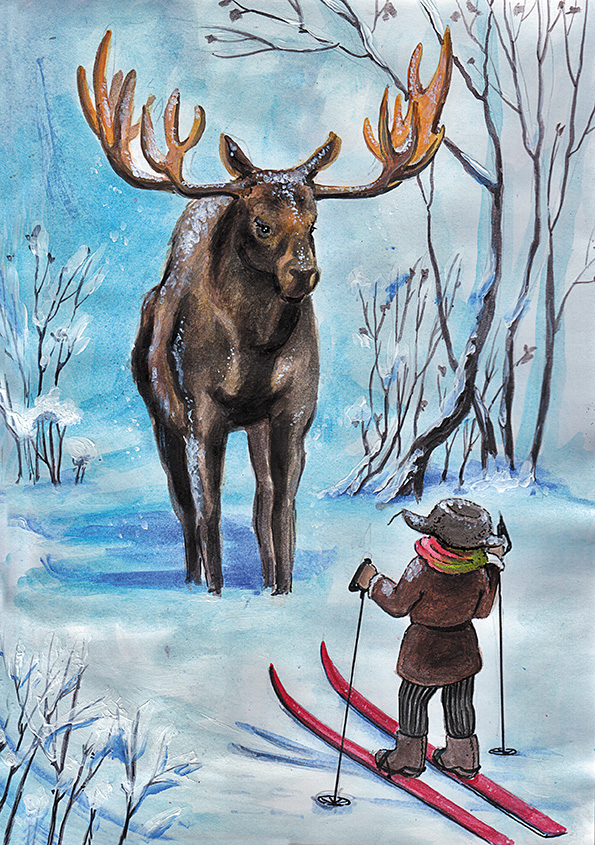 В это время Геннадий решил зайти в тыл плутовке, обойдя её по дну оврага. Он скатился по склону вниз, там лежали сугробы рыхлого снега. С трудом вытаскивая лыжи из снега, парень двигался вперёд. Но тут соскочило крепление с валенка, и ему пришлось потратить много усилий и времени, чтобы прикрепить его. Гена возился с лыжами, а спиной чувствовал, что за ним кто-то наблюдает. Он не ошибся – с левой стороны, метрах в шести, в ямке под крутым склоном лежал лось.