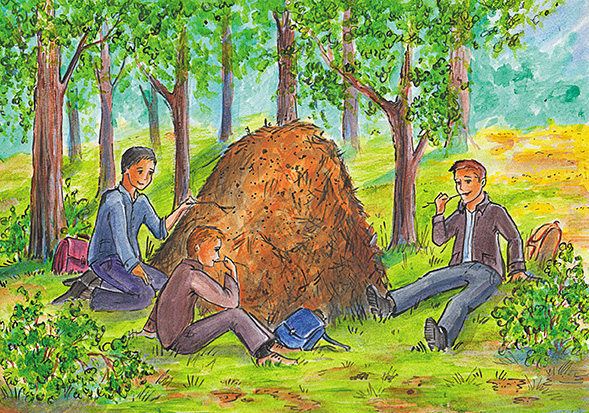 Они присели отдохнуть на опушке на кем-то спиленном дереве, наслаждались медовым ароматом цветов. Над цветами порхали бабочки, трудяги пчёлы собирали чудный нектар, а в ветвях деревьев пели птички на все голоса. Вдруг ребята увидели лесника дядю Толю, который неожиданно вышел на опушку леса. Лесник жил в одном селе с ребятами и даже был соседом Николая. Чтобы он их не увидел, мальчишки спрятались за густыми зарослями орешника, не забыв прихватить свои портфели. Когда лесник ушёл, Михаил с облегчением выдохнул и произнёс: «Фу, едва не спалились». Он посмотрел на Николая, затем на Алёшку и продолжил: «Пойдём покажем Коле большой муравейник, он такого никогда не видел!» Поплутав по лесу, мальчики отыскали огромный муравейник, запримеченный ими ещё с осени. Муравейник величественно возвышался над пнями и другими муравейниками. Николай такого действительно не видел – в высоту он достигал их роста. Михаил, а затем Алёшка сломали по небольшому прутику, намочили слюной и положили на муравейник, Николай последовал их примеру. Влажную веточку тут же облепили муравьи. Через некоторое время ребята взяли прутики, стряхнули насекомых и с наслаждением стали их облизывать, наслаждаясь кисло-сладким вкусом муравьиной кислоты.