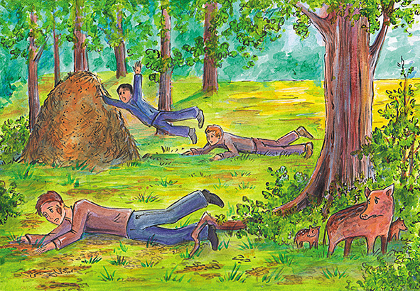 Друзей охватил такой страх, что они со всех ног бросились бежать без оглядки. Николай пробежал метров пятьдесят или больше, как почувствовал, что его за ногу схватила кабаниха, и он в тот же момент упал лицом в прошлогодние листья. Он попытался вырвать ногу, но ничего не получалось, он даже почувствовал боль. «Всё, сейчас меня свинья разорвёт в клочья», – пронеслось у него в голове. Лишь когда трясущейся от страха рукой смахнул с лица прилипшие листья и посмотрел назад, то увидел, что никакой свиньи нет, а нога запуталась в корнях деревьев. Он с трудом освободил пораненную об острый обломок корня ногу и, поднявшись, выплюнул попавшие в рот сухие травинки и листья. Сердце учащённо билось, руки дрожали. Успокоившись, Николай негромко всё ещё дрожащим голосом сказал: «Фу ты, так напугался, что чуть не описался!»