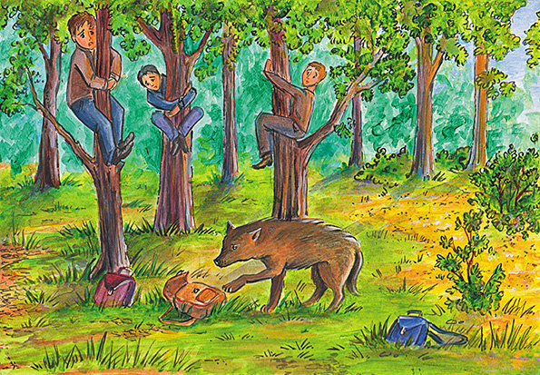 Но тут на поляне показался волк или большая собака, разобрать было трудно, ведь у страха глаза велики. Зверь грозно зарычал и побежал в сторону мальчишек. Ребята, не мешкая, мигом забрались на деревья и с испугом смотрели вниз. Зверь подбежал, обнюхал портфели, особенно Алёшкин, даже пытался носом залезть внутрь, по-видимому, чувствовал запах бутерброда с колбасой, который там раньше лежал. Затем несколько раз гавкнул на мальчишек, сидевших на деревьях, и побежал прочь. Как потом оказалось, это был пёс лесника дяди Толи, который отстал и искал хозяина. Ребята ещё долго не решались спуститься вниз, поэтому домой пришли позже своих одноклассников.
