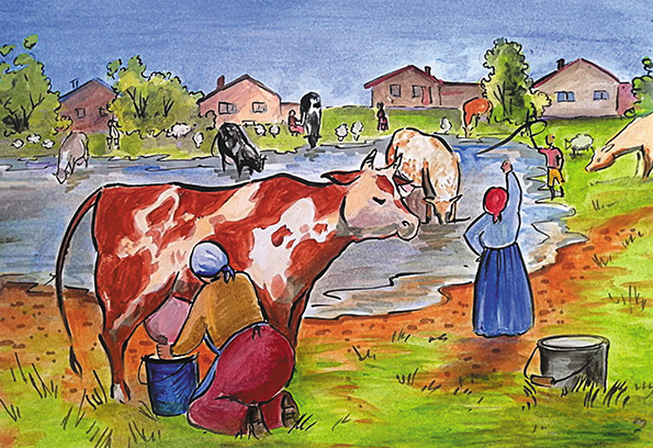 В полдень стадо не спеша погнали в стойло к тому самому пруду, за окраиной села, где животные утром утоляли жажду. Коров на дойку надо пригнать вовремя, иначе животных, вымя которых наполнено молоком, невозможно будет удержать. Когда стадо оказалось у пруда, бурёнки с неимоверной скоростью бросились к воде и стали утолять жажду. Несколько коров, спасаясь от назойливых мух и оводов, залезли в пруд. Пришедшим их доить хозяйкам стоило большого труда выгнать их оттуда, а некоторым женщинам пришлось заходить в воду и хворостинкой выгонять своих коров.