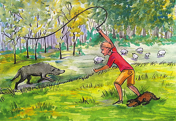 Приглядевшись, понял, что это волк. Зверь, не обращая внимания на Михаила, направился к пасущимся недалеко овцам с ягнятами, намереваясь, по всей видимости, схватить ягнёнка. Михаил, недолго думая, щёлкнул кнутом изо всей силы. Звук получился громким, похожим на выстрел. От неожиданности волк остановился и даже пригнулся к земле. Пока зверь определял, откуда может исходить опасность, Михаил приблизился на расстояние длины своего кнута и стеганул по волку так, что на шкуре мгновенно проступил красный рубец. Волк взвизгнул и, поджав хвост, бросился бежать к лесу, едва увернувшись от удара кнута папы, и скрылся в чаще.
