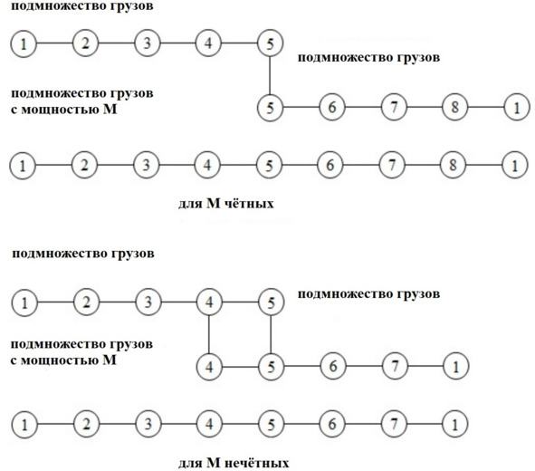 4) поэтапное объединение подмножества грузов меньшей мощностью грузов в подмножества грузов большей мощностью с последующим упорядочением до получения подмножеств грузов с числом грузов (1)/2 для нечетных и с числом грузов 2 +1 для чётных и выбором, в дальнейшем, множества грузов подмножеств грузов большей мощности с их наилучшими суммарными весами и соответствующей суммарной ценой согласно N.; М+ М М/ М уг
