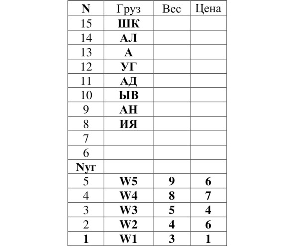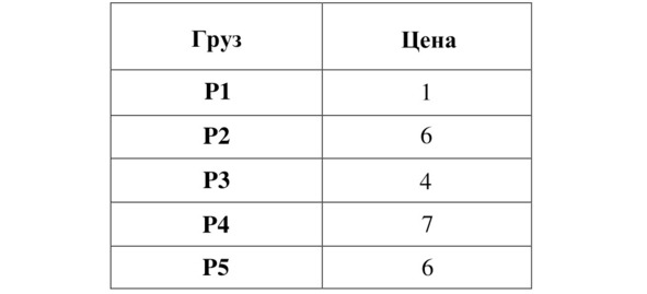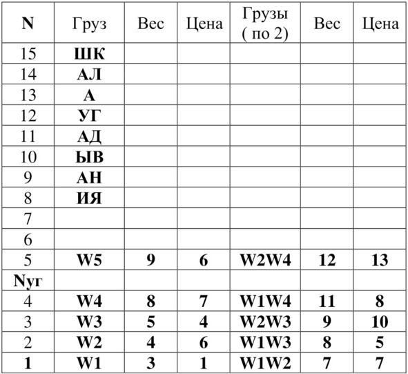 Занесём определённый упорядоченный вектор грузов относительно значений весов грузов и их цены в таблицу 5.