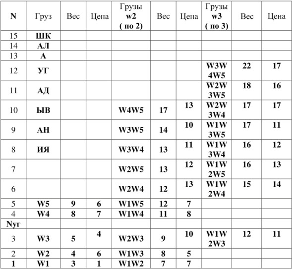 Полученные упорядоченные вектора подмножества грузов по два и по три и их значений суммарных весов грузов и цен занесём в таблицу 5.