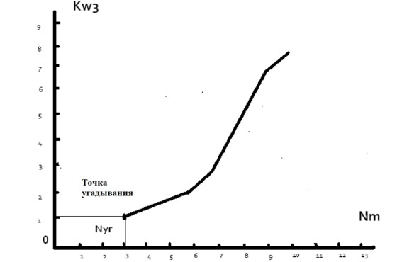 Основываясь на данных из таблицы, определим зависимость числа подмножеств по три (Kw3) с суммарным весом грузов больше или равно W = 12, от числа угадывания (N) на шкале угадывания (Nm) для данного метода.