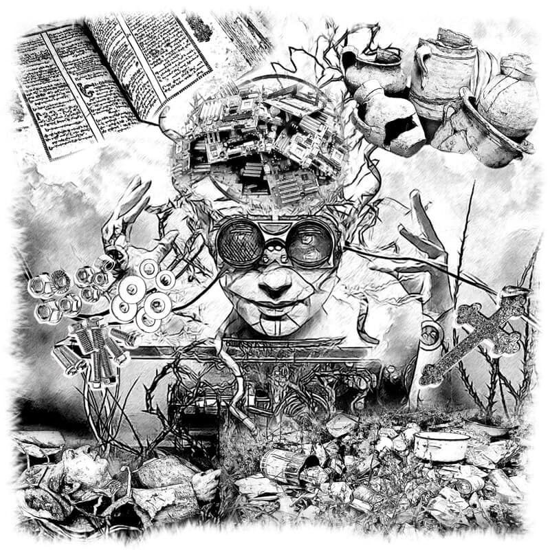 Самый первый, верхний пласт хлама состоял из поломанных плат, сколотых чипов и ярких фантиков желаний построения глобального общества. Затем в слоёном пироге следовала россыпь болтов и гаек, обмазанных бурой краской, очень похожей на запёкшуюся кровь. Средние слои были настолько испачканы сажей, что невозможно было понять – то ли это шедевры мусорного искусства, то ли городские отбросы.