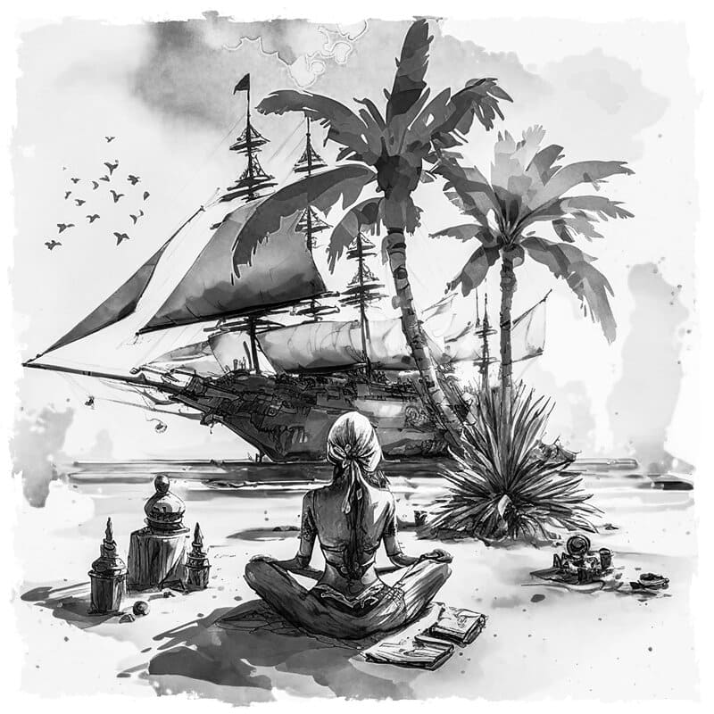 Белоснежные паруса с жадностью заглатывали дующие с берега потоки воздуха и уверенно гнали деревянное судёнышко в открытое море. Опытные матросы с чувством глубокого достоинства деловито управляли кораблём, обходя скрытые под водой мели и пробираясь между остро выпирающими рифами.