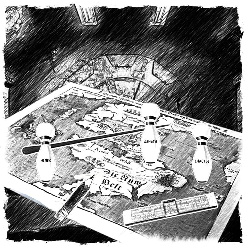 Кое-где на разложенном широком листе, издалека похожем на настольную игру типа бродилок, между серыми потёртостями и жирными пятнами стояли разноцветные игрушечные фигурки. Все они были похожи на зазипованные кегли для игры в боулинг – с большими головами и пузатыми телами. По окружностям их пластмассовых монументальных талий виднелись наклейки с надписями. Жёлтая фигурка гордо выпячивала «Счастье». Красная, пыжась, раздувала слово «Успех». Зелёная, издавая звук шелестящих листьев, показывала всем «Деньги». Иные игровые пешки были не менее изобретательны в демонстрации окружающим всего спектра основополагающих ценностей.