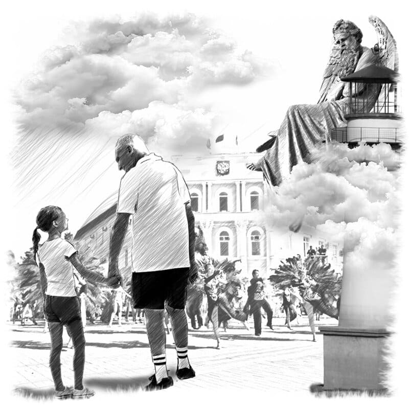 Прикомандированный небожитель периодически подмигивал веселящемуся хороводу оранжевым глазом в такт ударам барабана. Через некоторое время он заметил спешащих мужчину и девчушку, пытающихся успеть насладиться ярким зрелищем. Поравнявшись, марафонец в возрасте посмотрел на маяк, прямо в глаза Сатурну. Их взгляды встретились, словно жаждали обменяться некой информацией. Что хотели рассказать друг другу Бог на пенсии и простой смертный человек, было неизвестно.